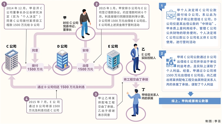 甲通过“集体研究”将C公司公款1500万元拨付给D公司后借给E公司使用,并要求E公司将某供配电工程交由其特定关系人丙的亲属丁承揽,该行为应如何定性?